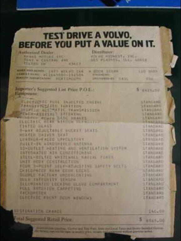 I have the window sticker, owner's manual and all other new-car literature that came with it, the original Volvo fuses and box, Volvo 164E Microfiche for parts, and original Volvo 164E Service Manual.